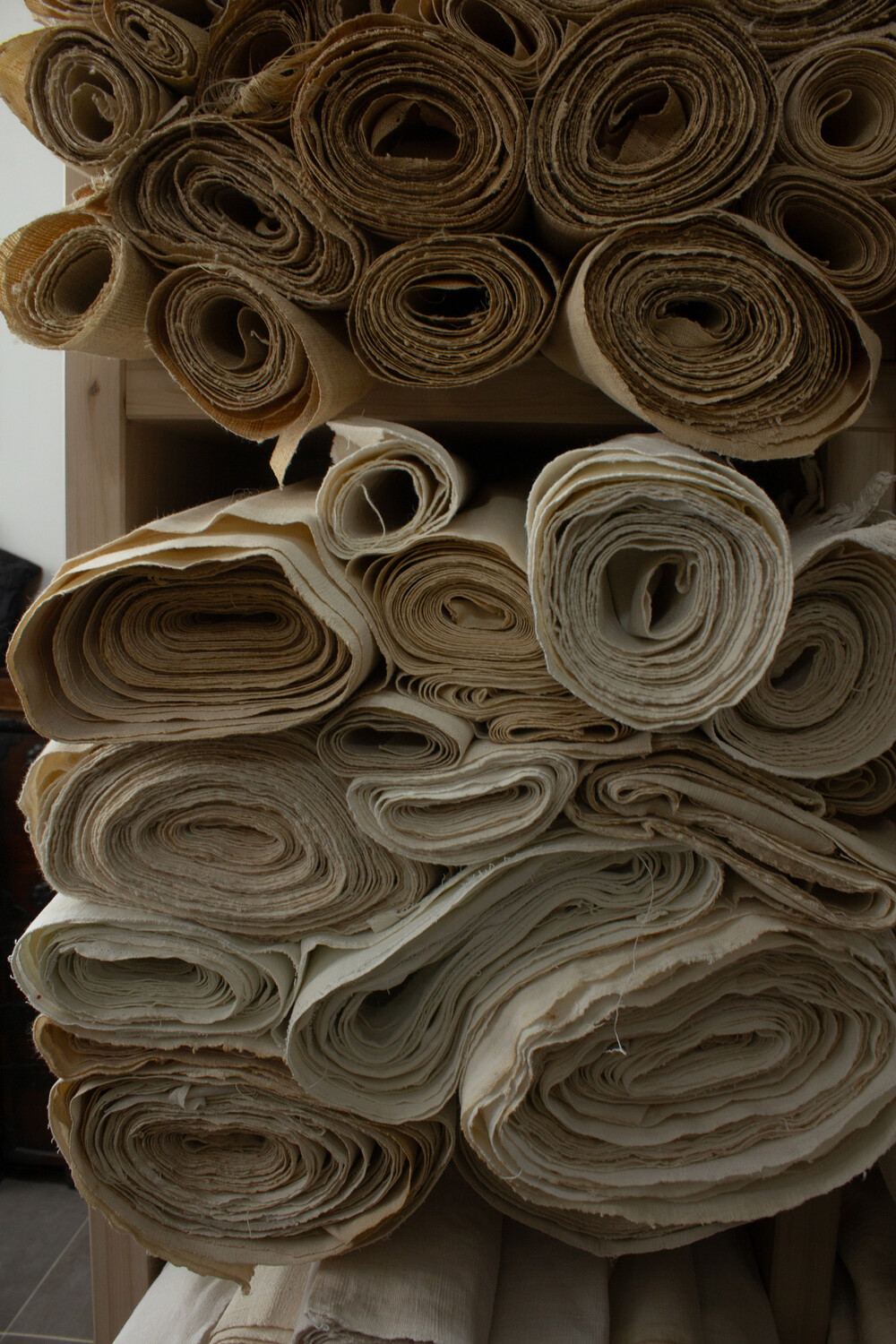 이렇게 정성스레 만들어진 원단은 빛을 품으면 올의 미묘한 불균형이 오히려 깊이를 더하며, 오래된 시간만큼 깊어진 촉감은 거친 듯 부드럽습니다. 잊혔던 전통의 아름다움 일제 강점기 이후 대량 생산된 면직물에 밀려, 손베틀 기술은 점차 잊혔고, 목화를 재배하고 원단을 짜는 행위는 이제 무형문화재가 될 만큼 귀해졌습니다. 저희가 이 무명 원단을 사용하는 것은 사라져가는 전통의 아름다움을 손끝으로 간직할 수 있는 소중한 마지막 기회가 될지도 모릅니다.