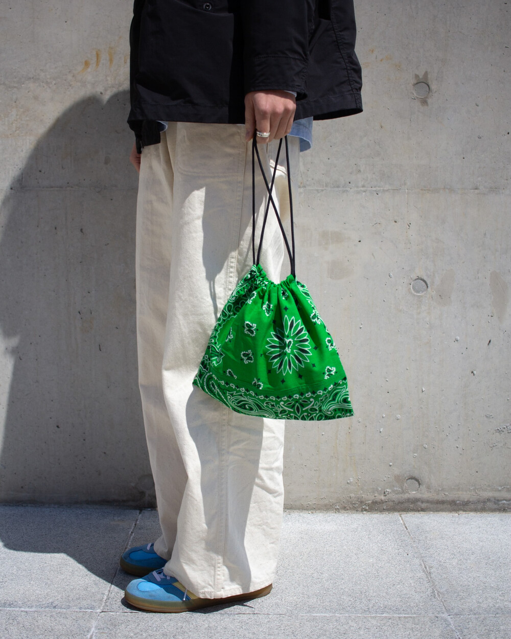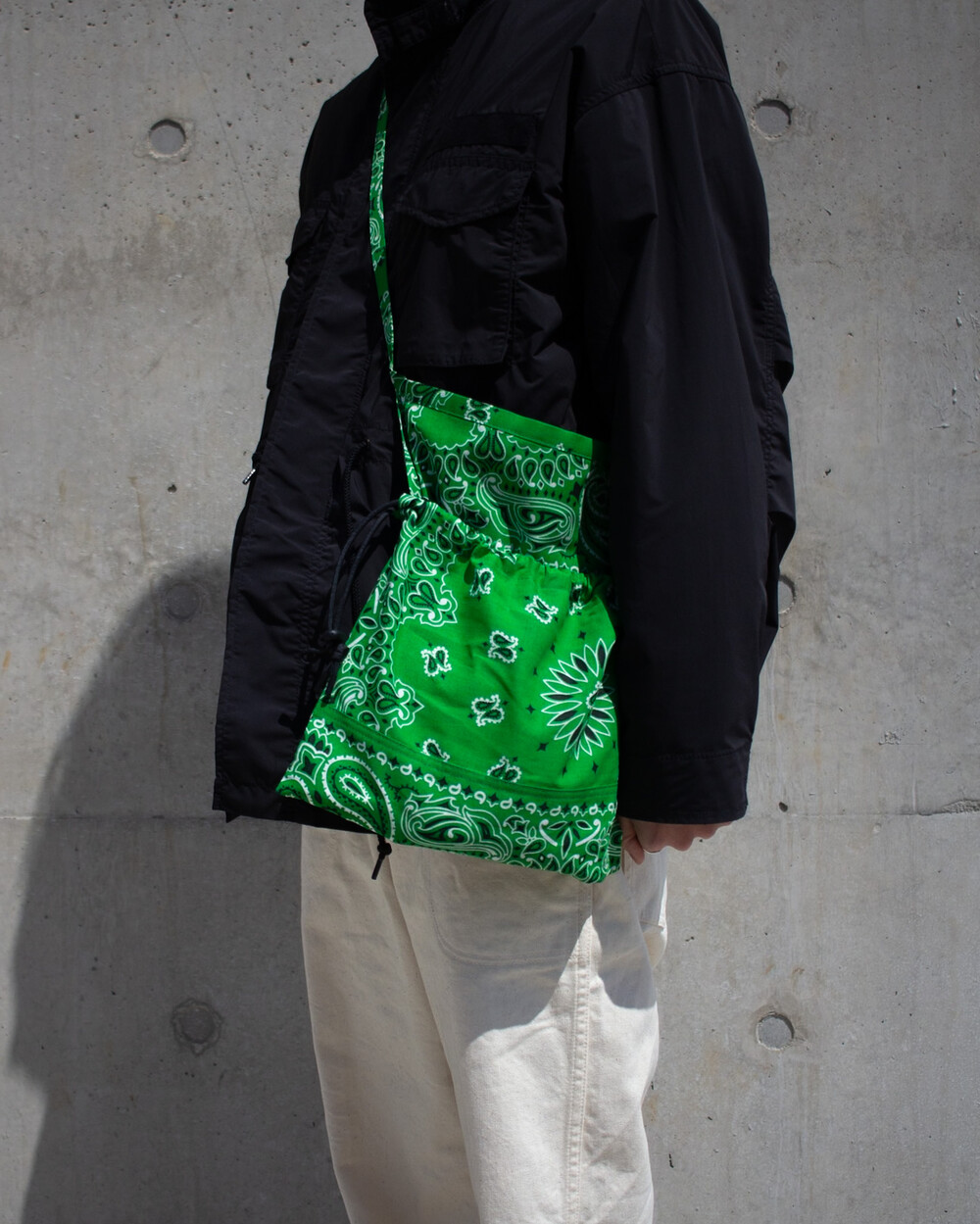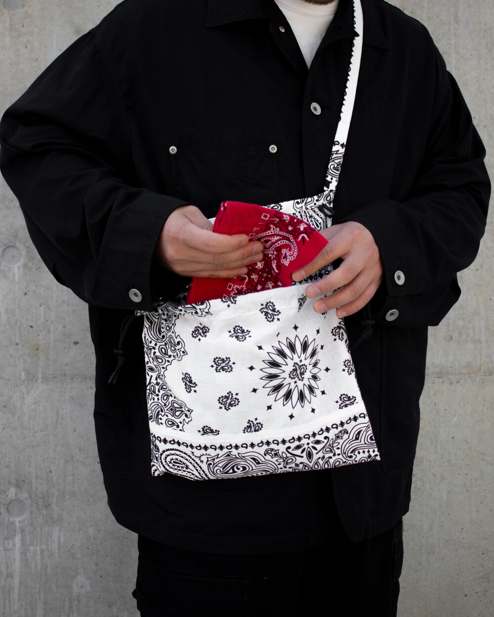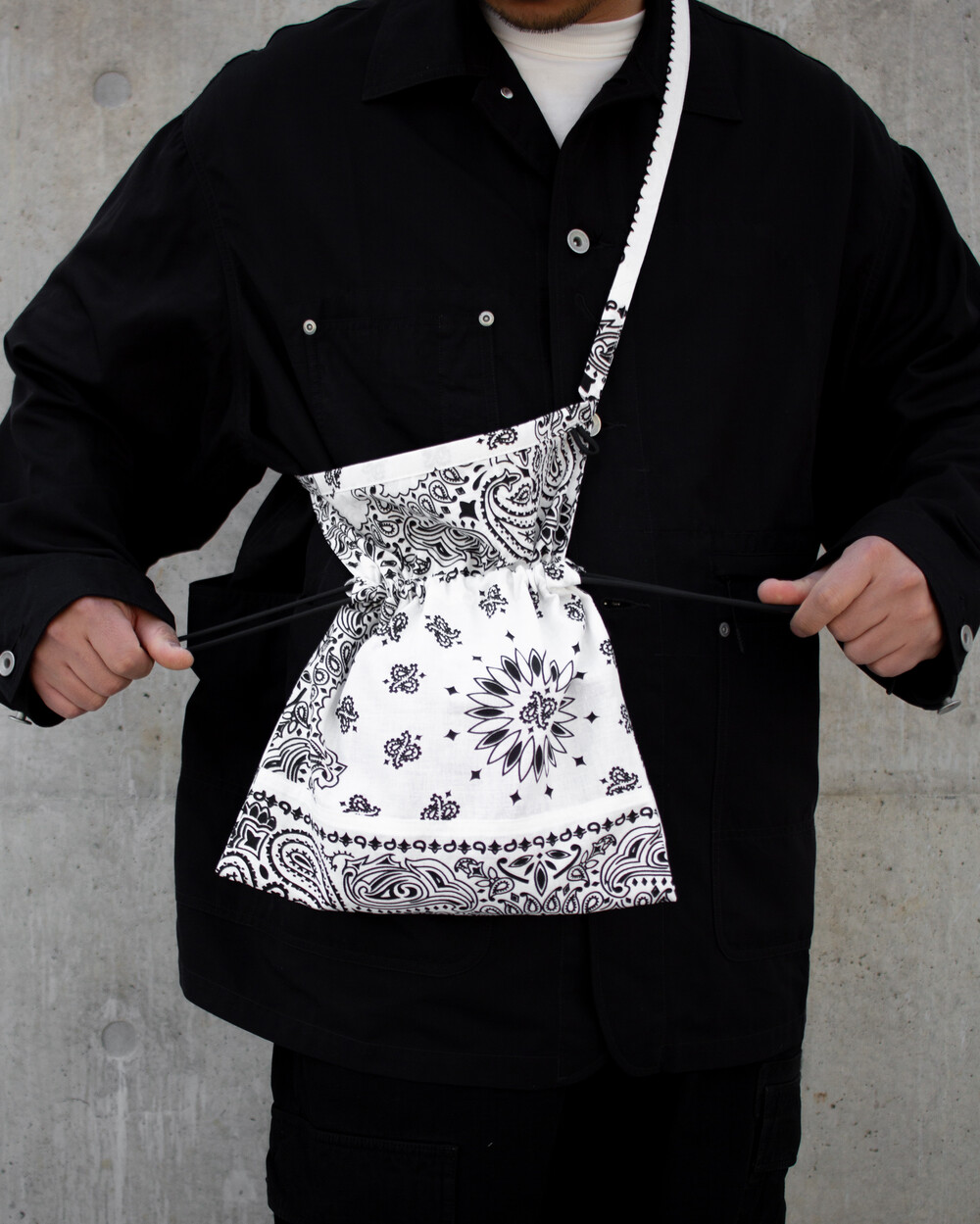 이번 에이프런백은 미국에서 생산된 페이즐리 반다나 원단을 사용하여, 문양이 자연스럽게 이어지도록 한 장씩 손으로 재단해 제작했습니다. 스트링을 사용하여 입구를 조일 수 있어 파우치 형태로도 사용할 수 있으며, 숄더 스트랩을 통해 숄더백이나 허리에 둘러 앞치마 형태로도 활용 가능합니다. 모든 공정은 수작업으로 이루어졌으며, 원단의 경년변화를 통해 시간이 지나며 더욱 매력적인 모습으로 변화합니다.