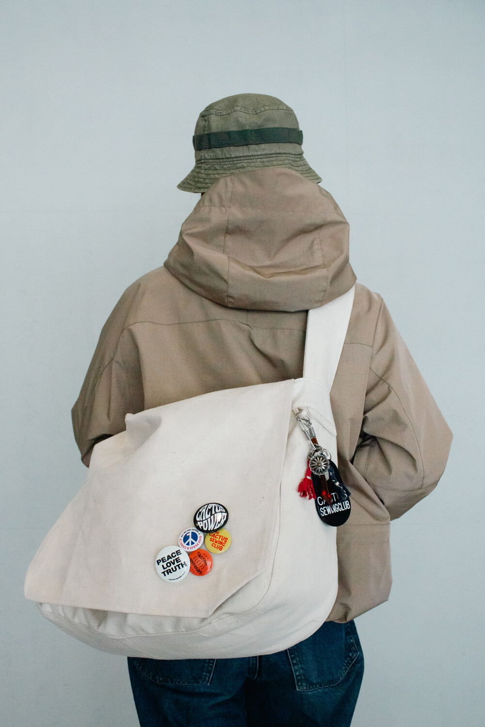 셔틀직기로 촘촘하게 짜인 Fujikinbai社 캔버스 원단을 사용해 자연스러운 주름과 질감이 살아 있으며, 사용할수록 캔버스 특유의 매력을 깊이 느낄 수 있습니다. 안쪽에는 두 개의 포켓을 더해 소지품을 효율적으로 수납할 수 있으며, 넉넉한 사이즈로 데일리부터 여행까지 폭넓게 활용할 수 있습니다. 덮개 부분에는 일본 Selex社의 버튼을 사용해 내구성과 디테일을 높였으며, 외부에서 보이지 않도록 설계해 깔끔한 인상을 완성했습니다. 스트랩은 금속 파츠 없이 제작해 자연스러운 흐름을 살렸으며, 70mm 폭으로 어깨 부담을 줄여 장시간 착용에도 편안합니다. 캑터스소잉클럽 오리지널 핀뱃지가 랜덤으로 함께 증정됩니다.